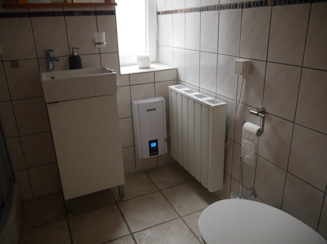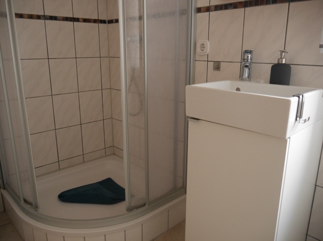 • Modernes Badezimmer mit Dusche, Waschbecken, WC und Fön
